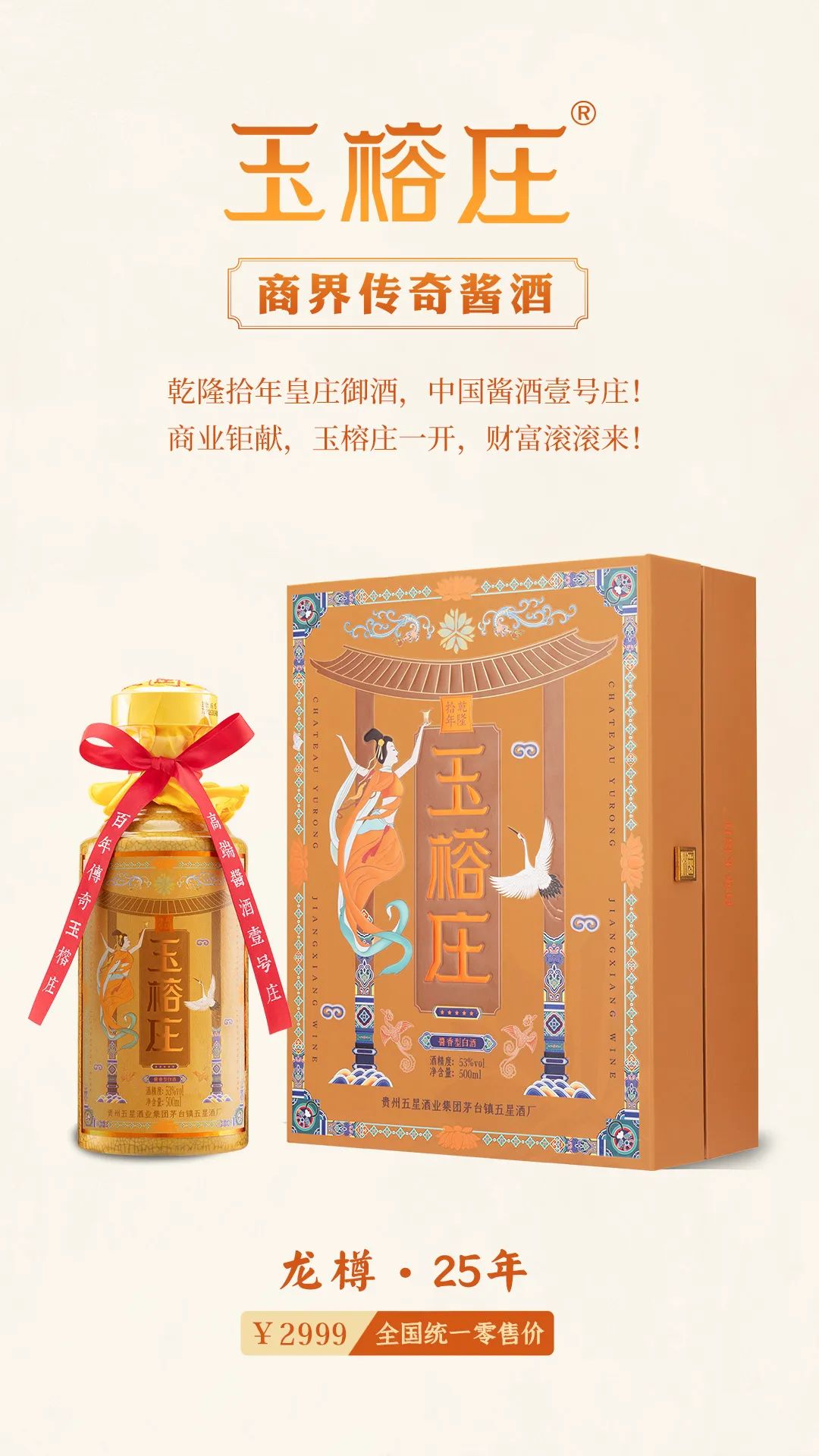 玉榕庄始于乾隆拾年,其生产的酱香美酒远近闻名,被誉为皇庄御酒。不仅酿酒,玉榕庄庄园奢华,城池楼阁堪比皇家园林钓鱼台,因此定位商界传奇酱酒,以“玉榕庄一开,财富滚滚来”的标语打开市场,适合作为商界精英的送礼酒品,助力事业更上一层楼!
