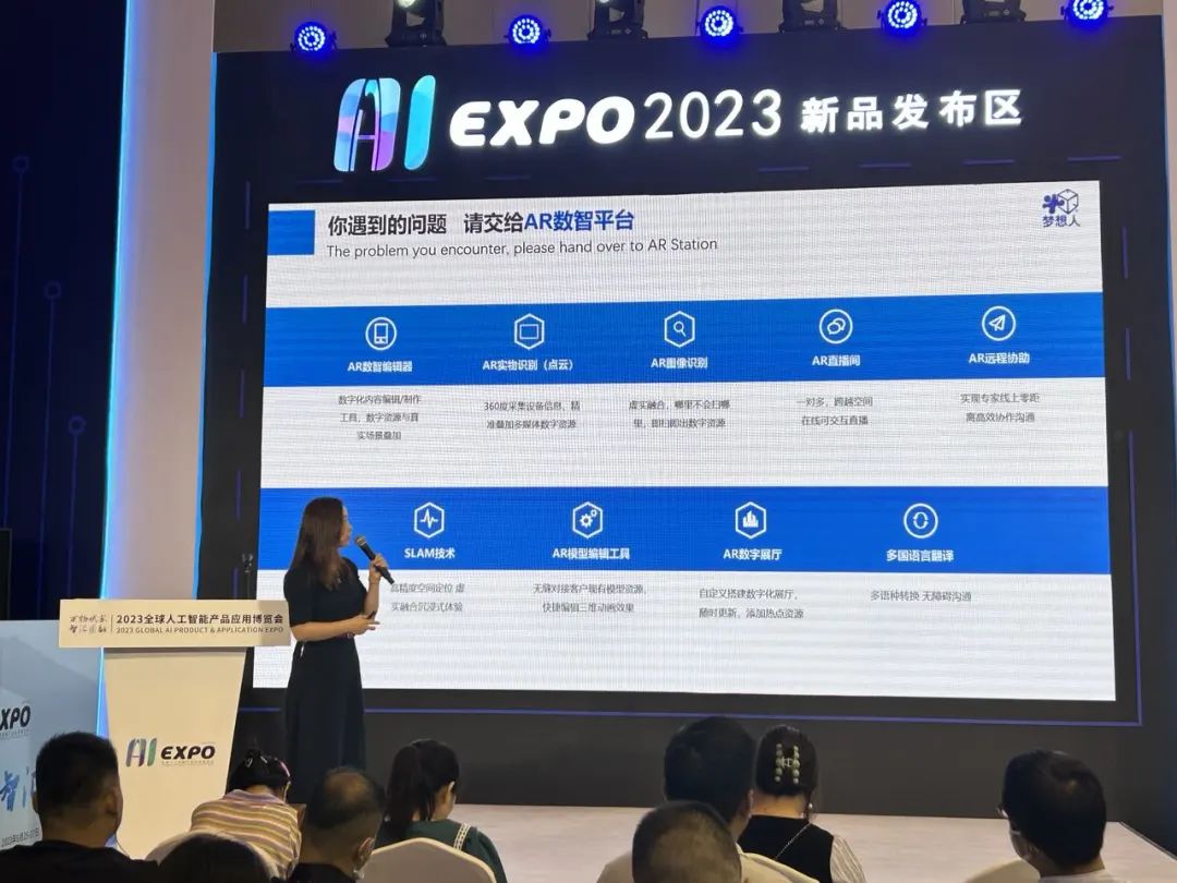 本届展会,梦想人重点展示“AR数智平台”在5G工业互联网、人工智能、图像识别、高精度定位等方面取得的突破性进展。其中,基于计算机视觉的毫秒级图像识别和跟踪技术、毫米级高精度空间定位技术的实物识别(点云)技术,可实现360度高精度信息采集;将设备的操作说明、注意事项、维保操作步骤等有效信息通过音视频、图片或模型的方式精准叠加在设备各个位置,将实物与数字资源融为有机整体,形成一种全方位、细致、精准、快速的检索方式,助力制造型企业数字化转型与产业升级。