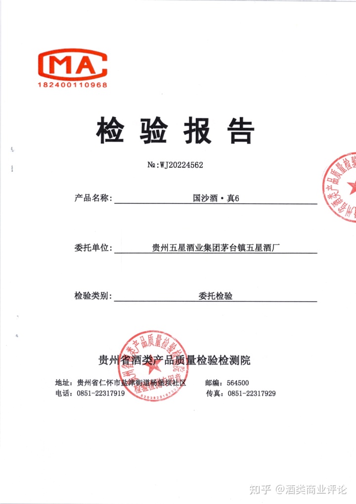 贵州省酒类产品质量检验检测院“国沙.真六”国检报告于2022年4月7日正式出炉。按国标GB/T 26760-2011标准,“国沙.真六”营养物质: 总酸含量2.04g/L(高于国标31.4%)、总脂含量3.03g/L(高于国标27.4%),杂醇及其他有害物质: 甲醛低于国标86%、乙酸乙酯低于国标96.7%、铅低于国标99.92%、氯化物低于国标99.3%。按国标GB/T 26760-2011标准杂醇油 白酒 标准,营养物质领先国标30%以上、杂醇等其他有害物质低于国标95%以上,大幅超过国家标准“优级”质量标准!