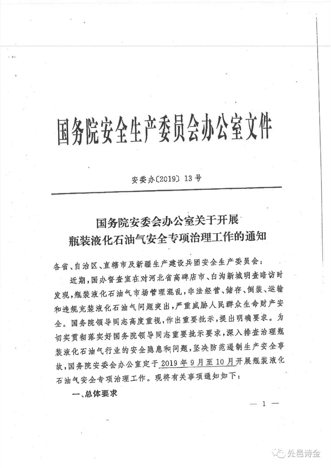 国务院安委会办公室关于开展瓶装液化石油气安全专项治理工作的通知(安委办〔 2019〕 13号)