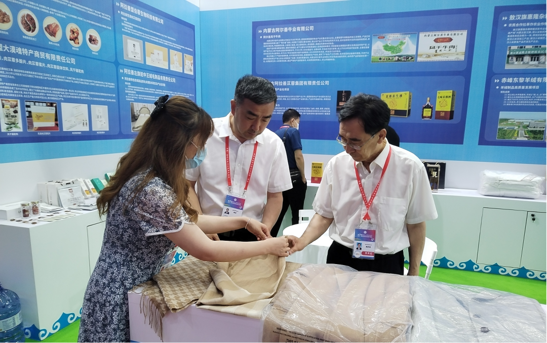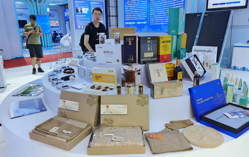 在内蒙古展区,工作人员向莅临海创会的领导、专家和参观人员详细介绍了阿拉善肉苁蓉、驼绒、驼奶等特色产业发展及科技创新成果转化情况,并展示了相关产品。展示产品分三大类,一是肉苁蓉系列产品,肉苁蓉粉、膏、切片、蜜饯、酒、茶、酵素、咖啡、压片糖果、固体饮料和饮品等;二是驼绒系列产品,驼绒被、大衣、裤子、围巾、帽子、手套、护膝及袜子等;三是驼奶系列产品,驼奶粉、酸奶及驼乳化妆品等。