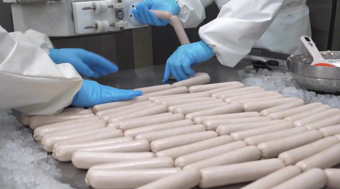 为了生产香肠,混合肉被切成小块,加入调料和添加剂。在切肉和混合的过程中抽空空气可以避免混合肉被氧化,而氧化会影响香肠的味道和外观。采用真空装置,在大约100mbar的压力下抽空空气。所采用的真空泵对一并抽出的肉和颗粒不敏感。