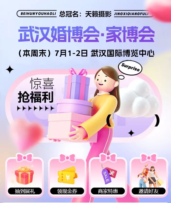 (本周末)7月1-2日,武汉国际博览中心双展同期开幕,如果你在为如何筹备婚礼·装修而烦恼,带上心爱的TA来婚博会,一起解锁结婚优惠秘籍~