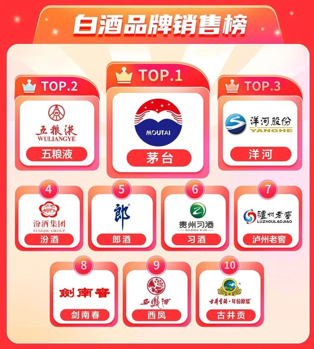 此次618,京东白酒板块销售前十名分别为:茅台、五粮液、洋河、汾酒、郎酒、习酒、泸州老窖、剑南春、西凤酒、古井贡酒。