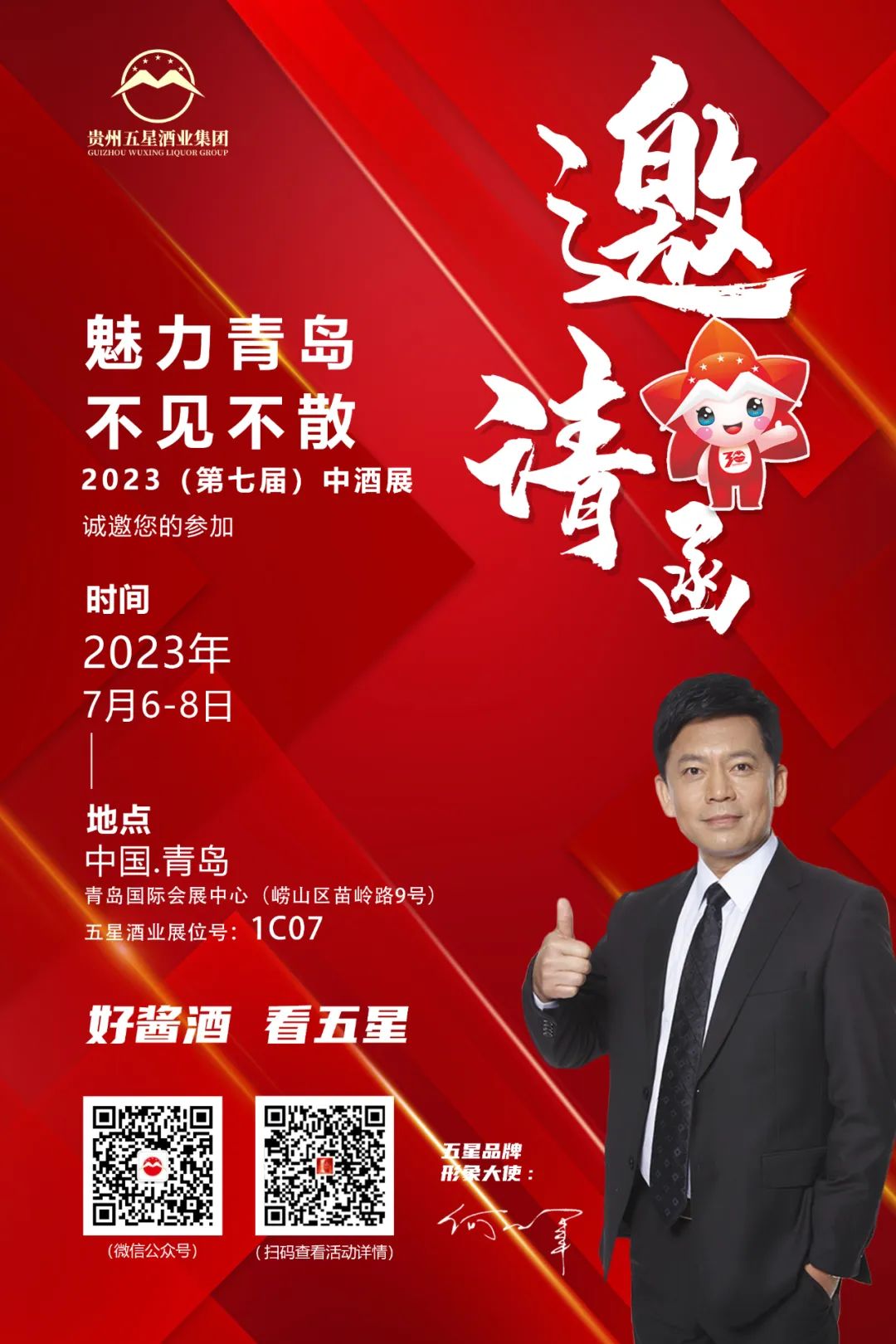 7月6日-8日,五星酒业邀您参加2023第七届青岛中酒展,欢迎莅临中酒展1C07五星展位现场,深度了解五星酒业企业文化与发展规划,共商大计,共谋未来,共享酱酒财富盛宴。我们与您不见不散!