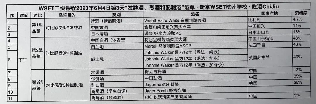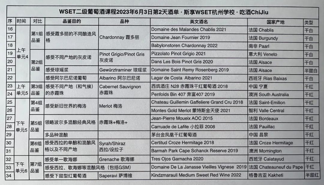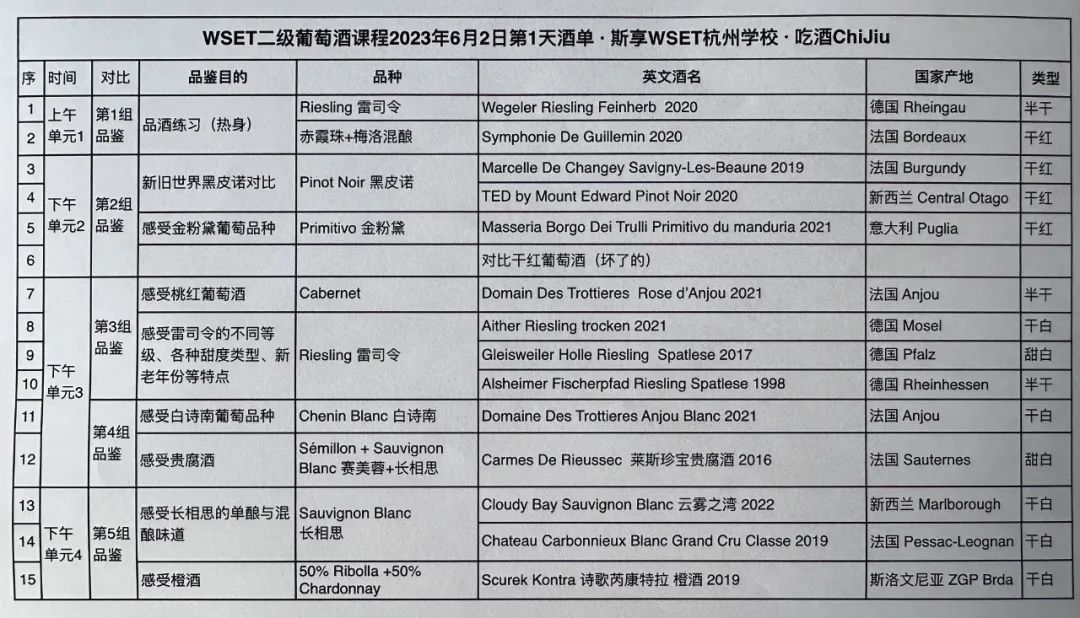杭州WSET二级课程,3天课堂品鉴酒单(葡萄酒部分),如下图,是2023年6月2~4日周五六日的课程酒单。每期课程,品鉴酒款还会适当更新。