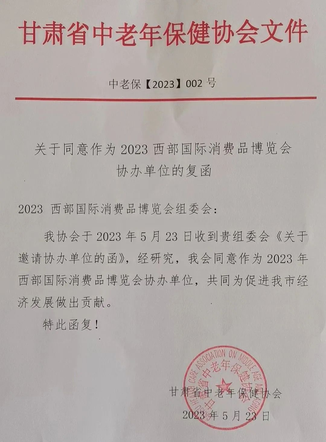 甘肃省中老年保健协会:同意作为2023西部国际消费品博览会协办单位