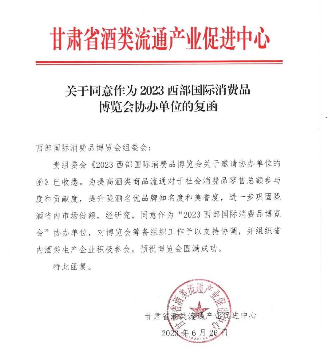 甘肃省酒类流通产业促进中心:同意作为2023西部国际消费品博览会协办单位
