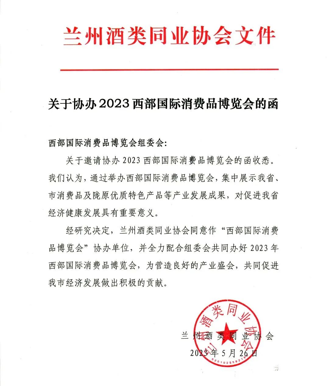 兰州酒类同业协会:同意作为2023西部国际消费品博览会协办单位