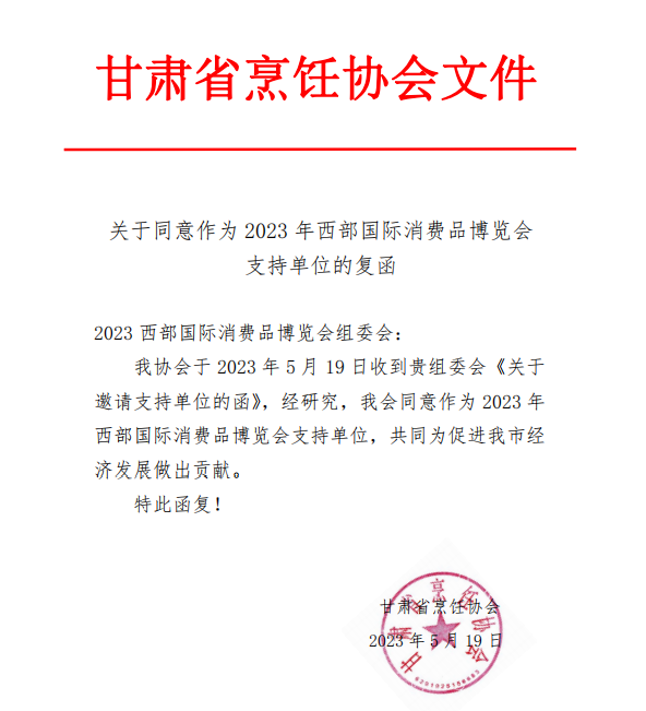 甘肃省烹饪协会:同意作为2023西部国际消费品博览会支持单位