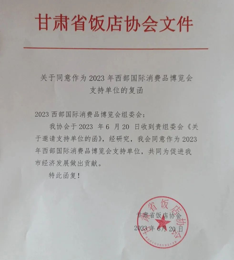 甘肃省饭店协会:同意作为2023西部国际消费品博览会支持单位