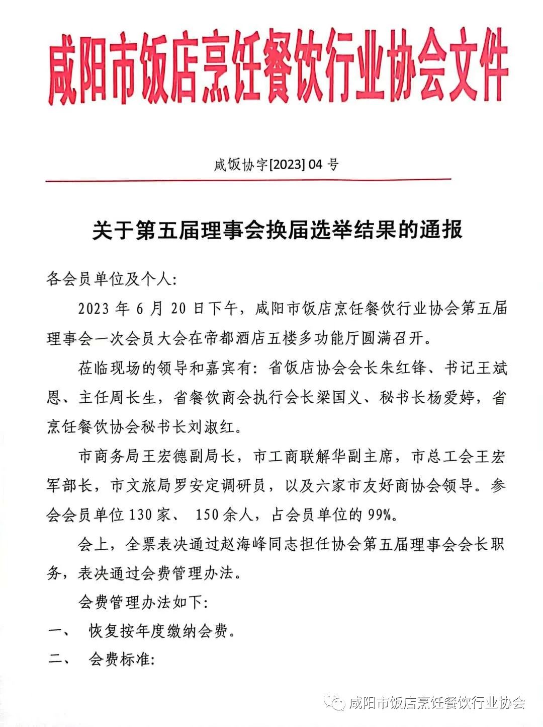6月20日下午,咸阳市饭店烹饪餐饮行业协会第五届理事会一次会员大会在帝都酒店胜利召开。