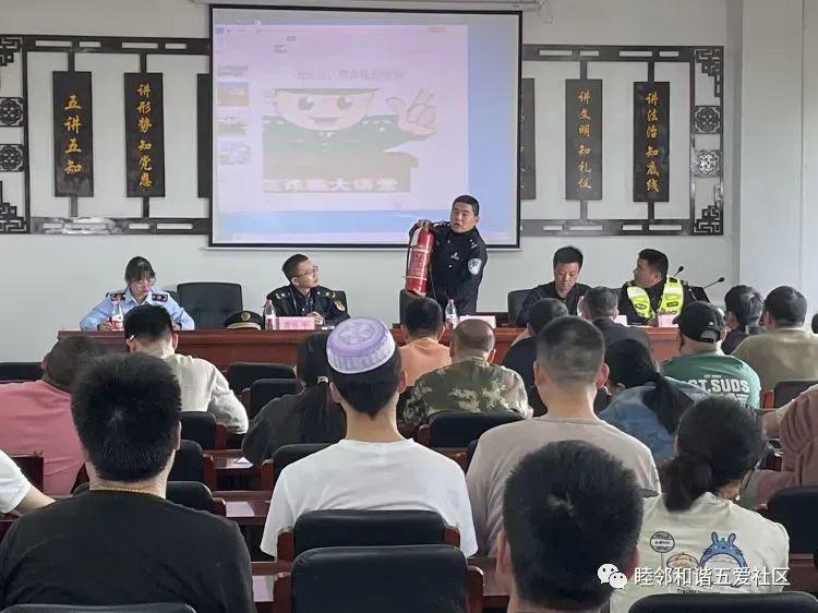 消防安全当然不可忽视,派出所的王警官为参会人员详细介绍并现场演示了灭火器的使用方法,大家看得非常认真。并反复强调,把反诈工作放在重要位置,提醒大家提高反诈意识,并讲解防范治理电信网络诈骗的相关知识。之后,又强调了加强暂住信息和外来流动人口的管理,全面推广“房东码”。