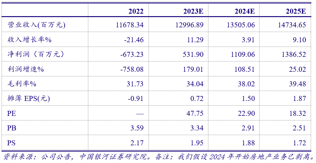 房地产业务从上市公司剥离事项取得实质性进展,业务清晰将提升公司对投资人的吸引力,我们认为交易价格区间相对合理。顺鑫农业是国内低档酒龙头,我们判断在消费疲弱的大环境中具备韧性。我们预计2023-2025年EPS 0.72/1.5/1.87元,目前股价对应P/E分别为48/23/18倍,首次覆盖,给予公司“推荐”评级。