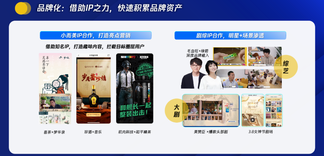 一部分品牌会更强调品牌背书和产品质量,通过提升品牌影响力来降低用户决策成本。比如品牌会与知名IP合作打造趣味内容,强势触达目标圈层用户,或是与剧综IP合作,借助明星影响力以及场景的持续渗透,快速积累品牌资产。此外也有品牌通过打造直播bigday或与互选达人合作的形式,强势占领用户心智,加速交易转化。
