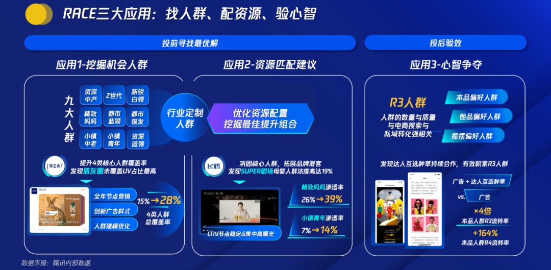 比如飞鹤为了巩固品牌核心人群,持续拓展品牌潜客,通过RACE的科学分析,在腾讯视频SUPER剧场进行CNY节点集中曝光,最终实现精致妈妈人群渗透率由26%提升至39%、小镇青年人群渗透率由7%增长至14%。