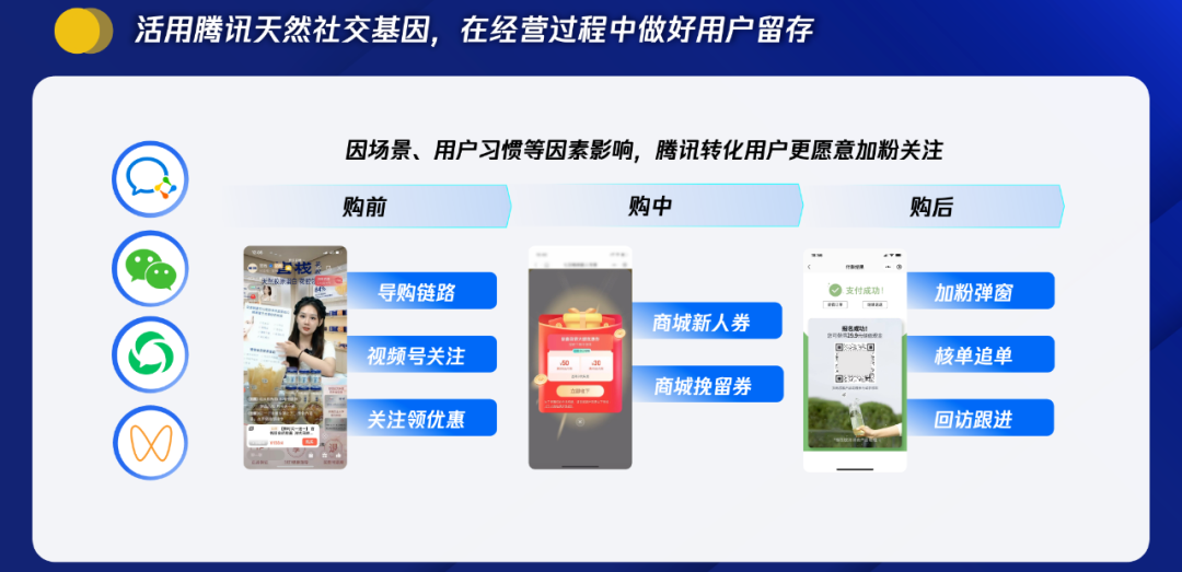 拥有庞大用户基数的腾讯生态可以说是品牌生意增长的天然流量池,且生态内的丰富触点可以实现紧密联动,形成以用户为中心的全域经营版图,帮助品牌做好生意的长效经营。此外,视频号作为新的流量蓝海,也将在公域流量补给、私域转化路径等层面上为品牌带来新的发展机会。