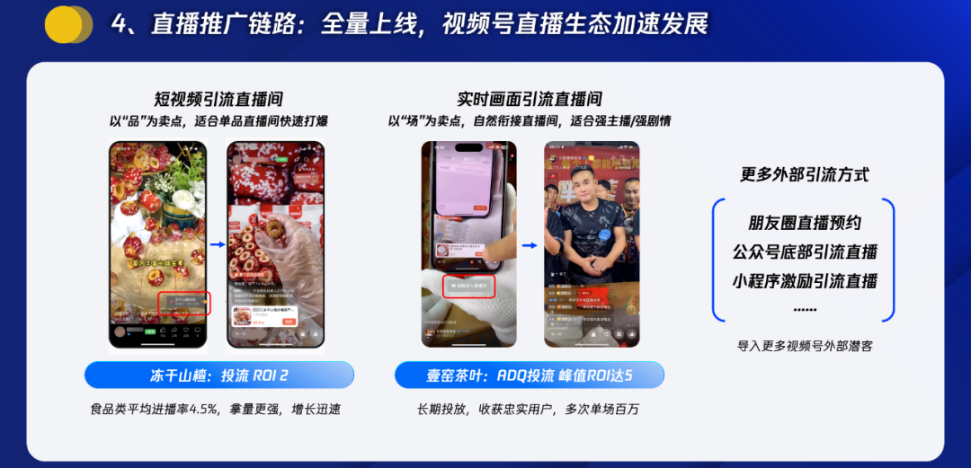 在不断优化直播形式与内容之外,品牌还可以投放视频号原生广告,利用短视频或直播实时画面为直播间引流,提升直播间的获客效率。某冻干山楂品牌通过重点投放直播间的主推单品,以用户试吃的优质短视频内容快速打爆了单品直播间,投流ROI达到2。在充分挖掘视频号的流量之外,品牌还可以选择朋友圈直播预约等方式引流,通过不同点位的组合辐射更多目标人群。