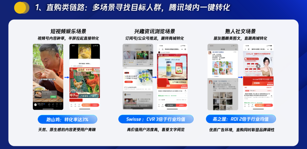 视频号、公众号、朋友圈……在腾讯生态内,品牌拥有大量和消费者进行沟通的触点与场景。品牌可以根据目标人群特性与品牌营销需求,在短视频娱乐、兴趣资讯浏览、熟人社交等场景中选择合适的场景,搭建直购链路实现快速转化。以某跑山鸡商家为例,商家通过真人出镜的试吃视频内容向用户种草自家优质产品,用户点击广告后即可半屏拉起直接购买,在为用户提供边看边买的优质体验之外,实现了3%的高转化率。