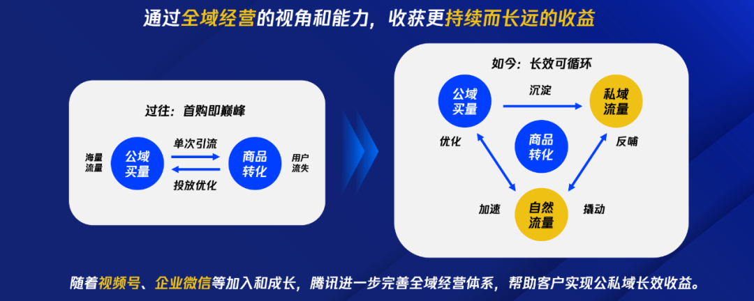 互联网飞速发展期,品牌在公域持续买量,拉动用户单次转化就能收获显著的增长。当爆发式增长成为过去,品牌必须拥有全域经营的思维,整合公域与私域,打通线上线下渠道,收获持续而长远的收益。