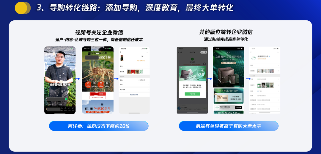 针对健康滋补等高客单、重服务的品类,品牌可以通过视频号等渠道引导加企微的方式留存到私域,通过导购的持续跟进与深度教育,与用户建立良好的关系,最终形成大单转化。以官栈为例,在用户关注或者首购后,品牌都会引导用户添加专属滋补顾问“官小胶”企业微信,并在与用户沟通过程中,持续输出产品的长期服用价值来提升复购转化。同时官栈还通过朋友圈广告、公众号、视频号等多个触点不断触达目标用户群体,并借助小程序实现购买闭环,最终收获品牌季度复购率提升40%、客单提升2.5倍的亮眼数据。