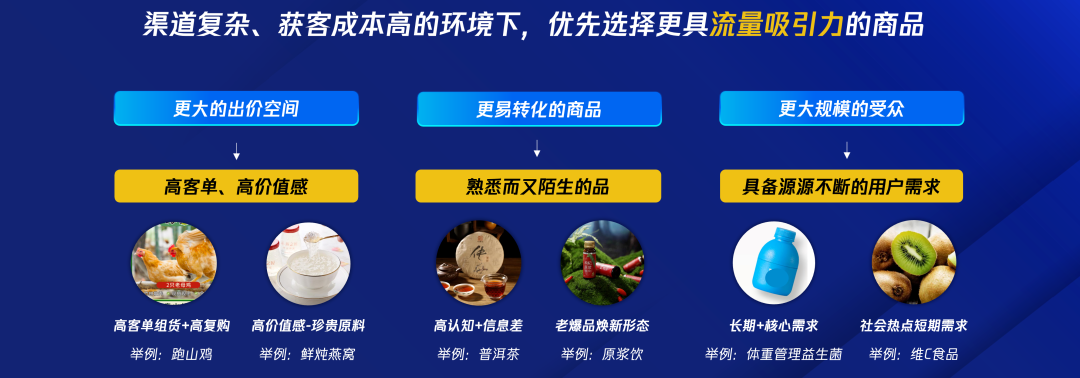 高客单价、高价值感的货品,如燕窝(高价值感)、跑山鸡(高客单易复购)等,能够为品牌在广告投放时提供更大的出价空间,提升广告的抢量能力