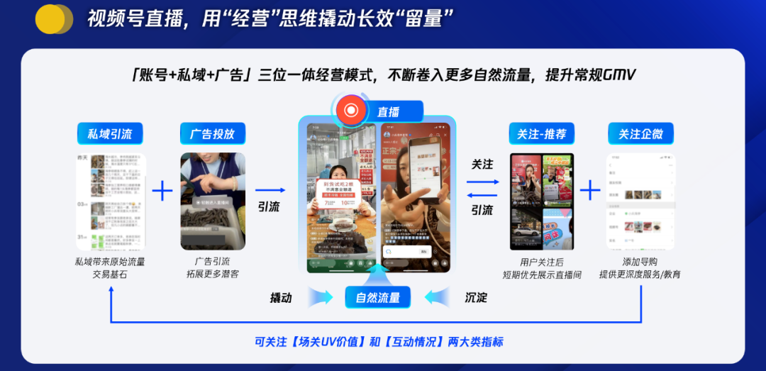 对于品牌来说,视频号直播并不单纯只是一个带货工具或增长渠道。视频号直播更大的价值在于能够长期经营每一场直播所沉淀下来的私域资产,从而实现持续的、长效的增长。一方面,品牌基于私域原始流量,借助公域投放为直播间引流,同时撬动更多自然流量进入;另一方面,用户无论是关注直播间还是企业微信,都成为了品牌的私域资产,能够卷入更多自然流量进入直播间。品牌通过这种“账号+私域+广告”的三位一体经营模式,持续沉淀、运营私域资产,不断提升购买转化,实现销量长效增长。