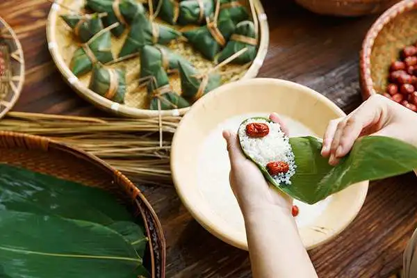 端午节吃粽子,这是中国人民的又一传统习俗。粽子,又叫做“角黍”“筒粽”。一般是前一天把粽子包好,在夜间煮熟,早晨食用。包粽子主要是用河塘边盛产的嫩芦苇叶,某些地区也有用竹叶。粽子的传统形式为三角形,一般根据内瓤命名,包糯米的叫米粽,米中掺小豆的叫小豆粽,掺红枣的叫枣粽,统称糯米粽。枣粽谐音为“早中”,所以吃枣粽的最多,意在读书的孩子吃了可以早中状元。