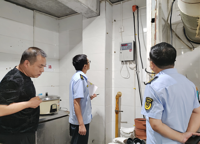 执法人员对漕河镇新一路餐饮经营户用气情况进行全面细致的检查,一查厨房使用何种类别燃料,二查是否按要求安装燃气泄漏安全保护装置,三查液化气钢瓶是否在规定检验周期内,四查是否正确安装燃气灶具和规范贮存液化气钢瓶。