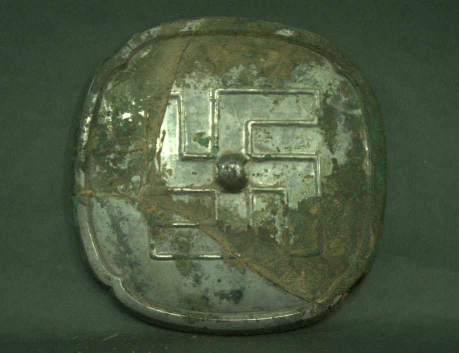 这件唐葵花形万字镜,虽然是一面残镜,但却是一件非常好的教学标本。直径 14.3 厘米,厚1厘米,镜呈葵花形,镜面较平,圆形钮,窄缘,中间有一大万,亮度极好,整体大唐风采浓烈,此类镜子均为盛唐时期所制。