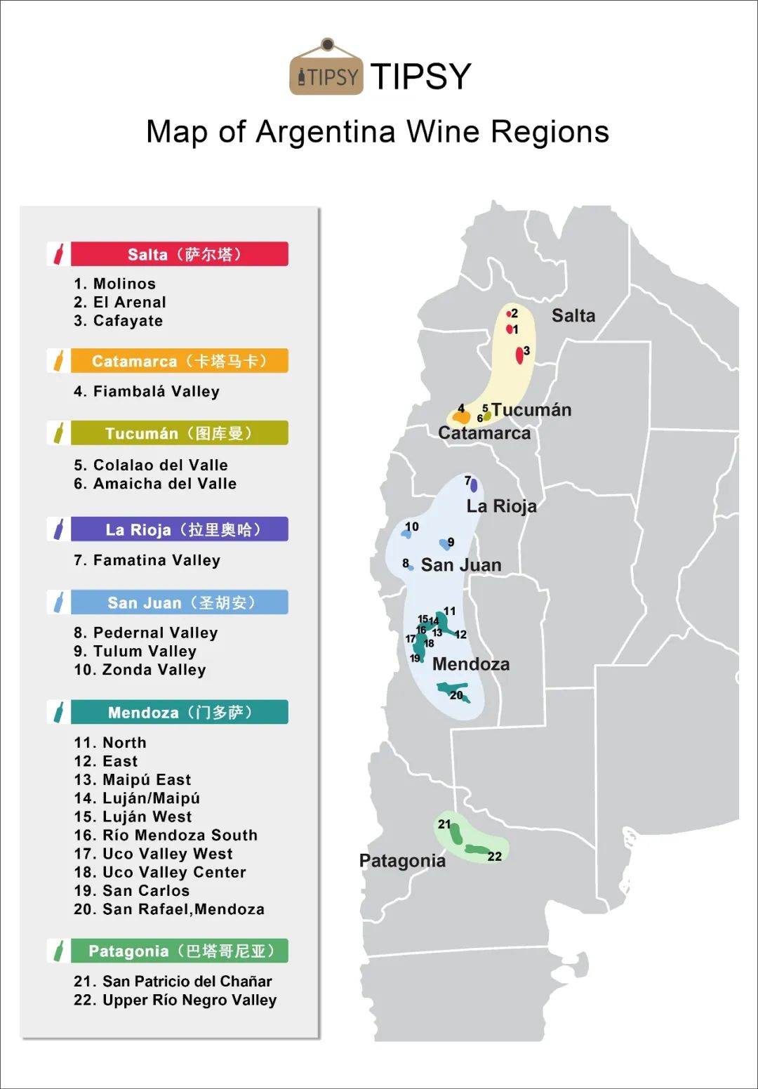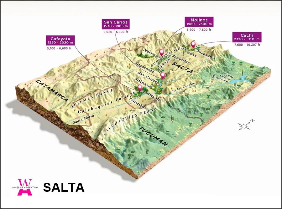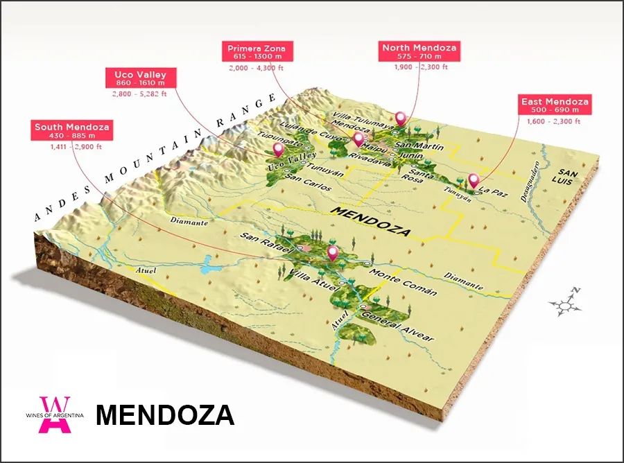巍峨壮丽的安第斯山(Andes)、世界之最的伊瓜苏瀑布(Iguazu Falls)、热情如火的探戈、恣意挥洒的足球和好客的人们,这些都是阿根廷常见的标签。除此之外,葡萄酒也是阿根廷传统的一部分。作为国饮,它与这里洋溢着努力和热情的人文精神交织辉映,从每一杯美酒中,你都能体会到这一点,所以,阿根廷的美酒又被形象地誉为“舌尖上的探戈”。虽然阿根廷属于新世界产酒国,然而其葡萄酒生产和消费的历史颇为悠久,可追溯至400多年前。16世纪,西班牙殖民者将第一株葡萄藤带入了美洲大陆。1551年,第一株葡萄藤在阿根廷落地,此后葡萄种植迅速从安第斯山脚延伸到国家的西部。凭借着优良的风土条件,当地的葡萄酒产业发展迅速。时至今日,阿根廷已发展出一个卓越的葡萄酒产业,集生产者、消费者和出口者的身份为一体,在世界舞台上熠熠生辉。既有高山又有平原,有丰富的植被与荒芜的沙漠,还有冰川与瀑布,阿根廷拥有丰富的自然资源和多样的地貌。其葡萄酒产区常坐落于靠近安第斯山脉的山谷上。高海拔是这些产区分布的一大特点,这赋予了它们独特的微气候。还有一部分产区分布在略有坡度的平原上,这些地区是葡萄生长的理想之地。这里的大部分产区都远离城市和海洋,气候干旱,再加上贫瘠的土壤以及春夏时期的霜冻,葡萄藤的生长环境可谓十分严酷。此外,其灌溉水源主要来自高山雪水,十分纯净,对生产有机葡萄酒极为有利。所有细节造就了阿根廷葡萄酒的独特和纯正。阿根廷分为三个大产区:北部产区(Northern Region)、库约产区(Cuyo Region)和巴塔哥尼亚(Patagonia)。每个大产区可分为若干个省份,而省份下又划分为更具体的小产区。北部产区以高海拔而著称,其中萨尔塔省(Salta Province)的一些葡萄园分布于海拔3000多米的高地,可谓是世界上海拔最高的葡萄园之一。除了高海拔这一特点以外,这里降雨稀少,气候温暖干燥,土壤排水性好。在这样的风土条件下,北部产区出产的葡萄酒浓郁纯净,可酿造出芬芳的芳香型葡萄酒。“库约”在当地的语言中是“沙漠之地”的意思,库约产区是阿根廷最干旱的地区之一,也是葡萄种植最集中的产区。极少的降水和纯净的冰川融水让这个地区与众不同。这里分布着拉里奥哈(La Rioja)、门多萨(Mendoza)和圣胡安(San Juan)三个省份。其中,门多萨是阿根廷的首要葡萄酒产区,其产量占全国葡萄酒总产量的70%以上。它有着悠久的葡萄酒酿造史,许多著名的酒庄都分布在这里。门多萨一共有10个知名的子产区,比较常见的有北部的Maipo、东部的San Martin、中部的Lujon de Cuyo、南部的Uco Valley地区。其中,北部地区非常适合种植白葡萄品种,比如Chardonnay、Sauvignon Blanc、白诗南、白玉霓(Ugni Blanc)和特浓情等;当然也种植着一些红葡萄品种,如西拉、赤霞珠、伯纳达和马尔贝克等。南部地区最有特色的则是白诗南。