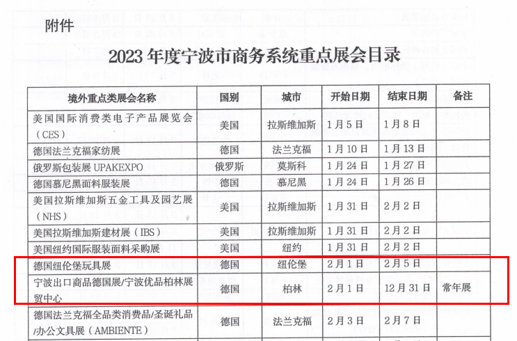 德国纽伦堡玩具展和宁波出口商品德国展销中心(常年展)都属于宁波市商务系统重点展会名录,政府加大对外贸企业参加各类境外展会的支持力度,参与即享有政府扶持政策补贴!