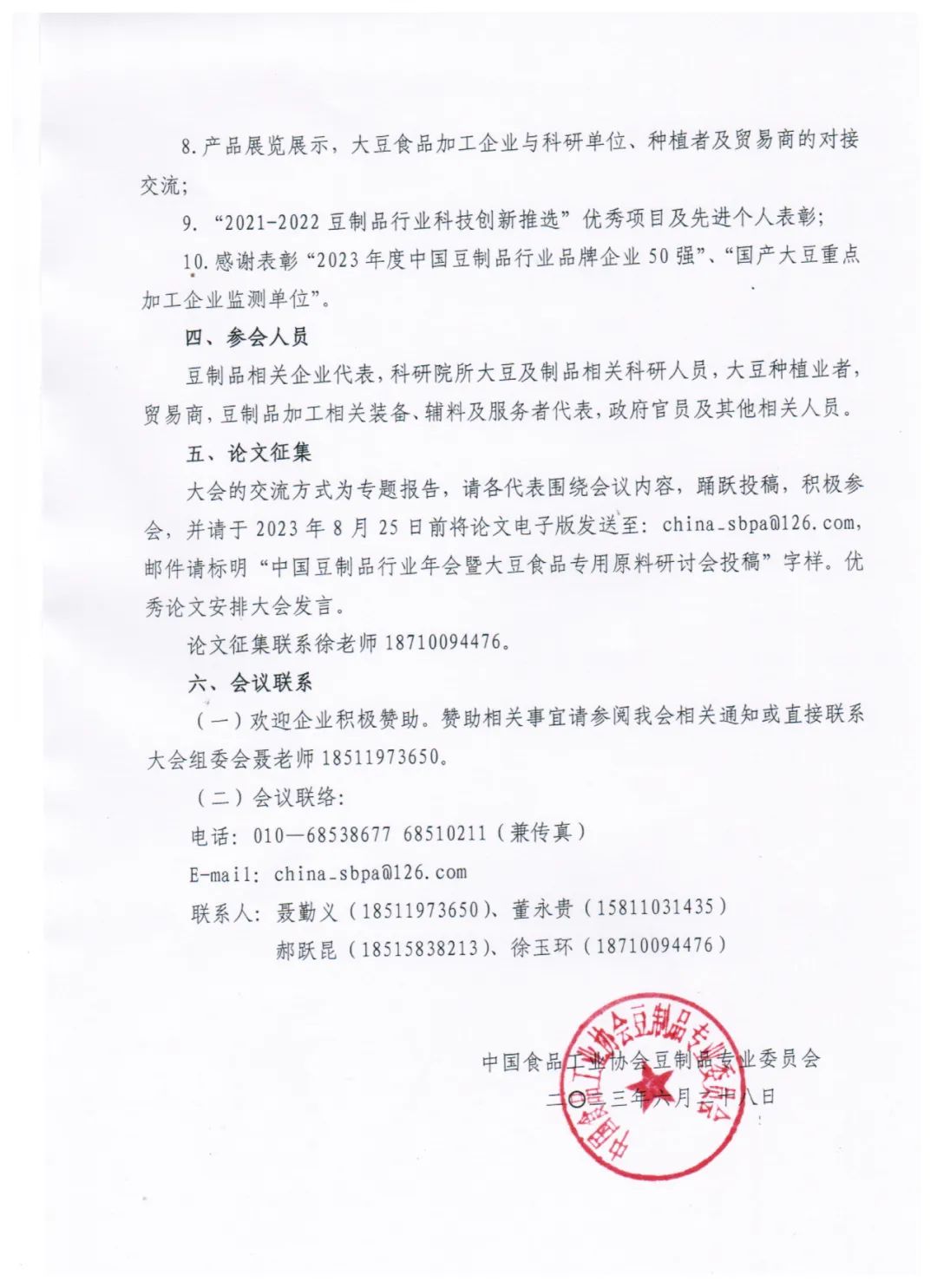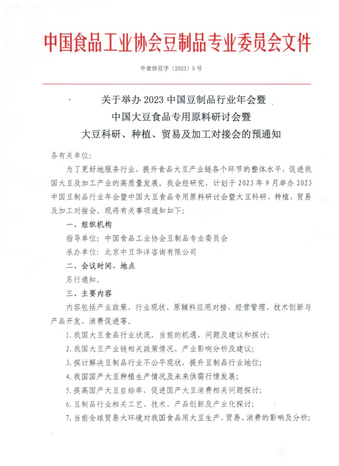 为了更好地服务行业,提升食品大豆产业链各个环节的整体水平,促进我国大豆及加工产业的高质量发展。我会经研究,计划于2023年9月举办2023中国豆制品行业年会暨中国大豆食品专用原料研讨会暨大豆科研、种植、贸易及加工对接会。现将有关事项通知如下: