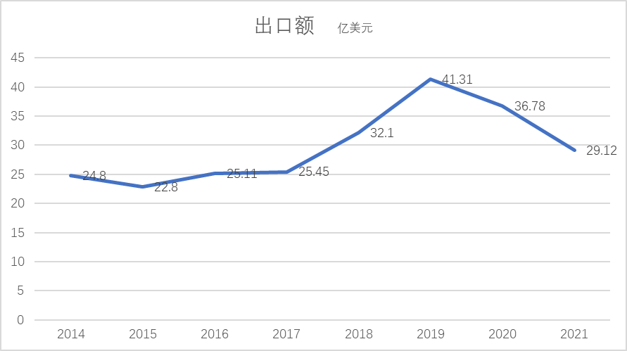 在出口额方面,2021年出口29.12亿美元。从趋势上看,2014-2017年中国绿色食品行业出口额较为平稳,年出口额约25亿美元,2018-2019快速增加,2019年出口41.31美元,但2020年起受新冠肺炎疫情影响,出口额开始下滑,预计随着2023年新冠疫情的放开,中国绿色食品行业出口额将恢复增长态势。