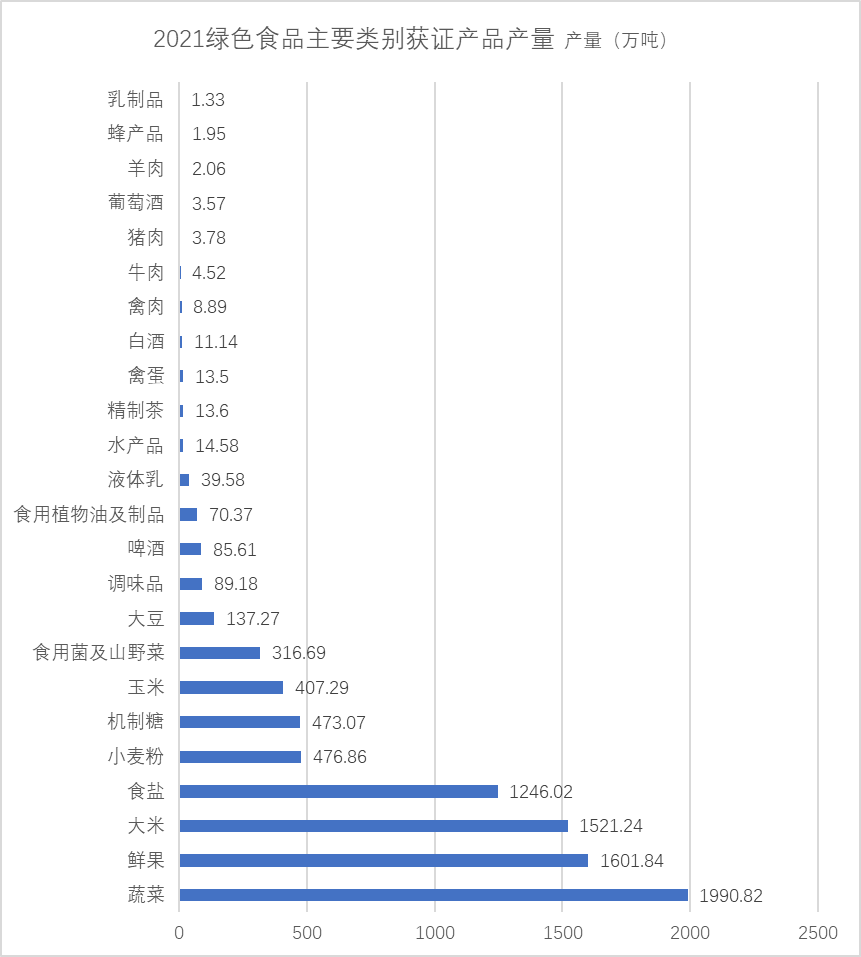 一直以来,蔬菜、大米、鲜果产量名列前茅,2021年中国绿色蔬菜获证产品产量为1990.82万吨;位列第一,其次是绿色鲜果,产量1601.84万吨,第三是绿色大米,产量1521.24万吨。