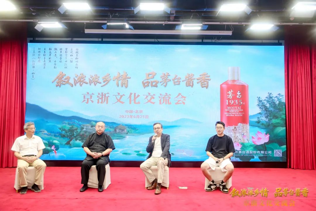 互动环节,北京湖州企业商会常务副会长李惠荣、贵州省茅台学院教育发展基金会理事崔立军、农业出版社原总编辑胡乐鸣、商会副会长邱中安受邀上台进行京浙文化交流,就后疫情时代的经济市场预期、企业家心态调整、商会建设等议题进行展开探讨。