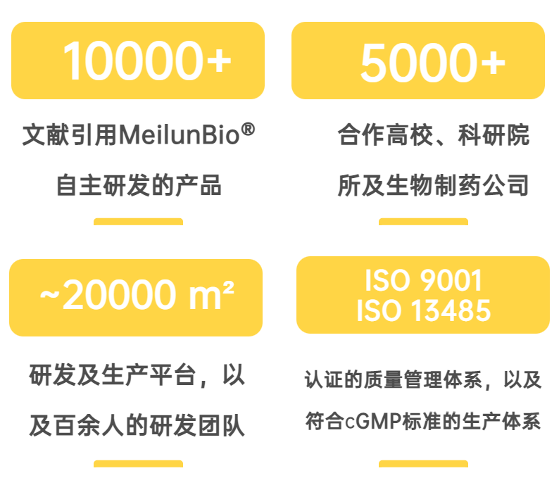 MeilunBio®已建成分子生物学、细胞生物学、原核真核蛋白表达及纯化、蛋白检测、动物实验和化学有机合成六大技术平台,并独立研发生产3000+种产品,广泛服务于生命科学基础研究、医学基础研究、药物开发及生产、细胞及基因治疗、体外诊断(IVD)等领域。MeilunBio®期待与全球科学家携手同行,共同探索生物之美,缔造科学之光!