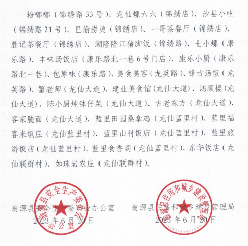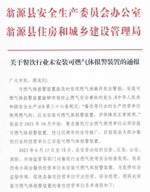 我县于2021年10月开始,已要求餐饮行业燃气使用单位必须安装可燃气体报警装置,现我县大部分餐饮经营单位均已安装,但在近日相关单位在检查中,发现仍有小部分餐饮经营单位未安装可燃气体报警装置。为发挥社会监督作用,促使各餐饮经营单位守法经营、安全经营,现将名单通报如下: