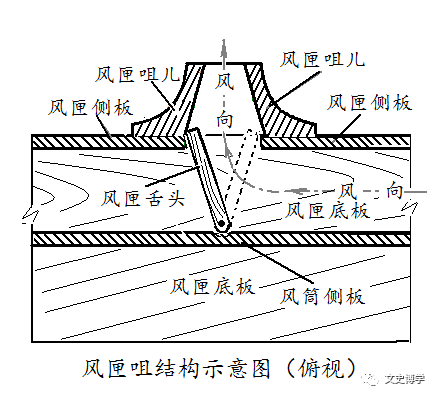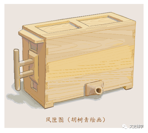 风匣内部右侧底部,有个方筒结构,不知俗名,权且称之为风箱内“副筒”。副筒是为了实现连续不间断古风的机构。“副筒”的中段对着风匣咀儿的地方,一有个活门儿,可以随着活塞板儿的其后运动而交替切换,从而保证连续向外鼓风。