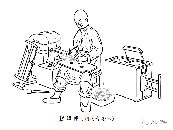 风匣使用一段时间,其鼓风能力会显著下降,这就需要进行维修。维修风匣有多种情况:有的风匣箱板破损了,扇风时漏气,这就需要把破损处插补起来;有的“呼吸门儿”(拍板式止逆阀门儿)坏了,需要修复;有的风匣杆儿磨损甚至折断了,这就需要换上新的风匣杆儿。而最多的是风匣里边的风匣活塞板儿上的鸡毛一儿老化、脱落了,不聚气,扇风无力。这就需要更换新的“鸡毛一儿”,以增加活塞板儿与箱板之间的接触摩擦,所以这种作业叫“糙(方言音:cào)风匣”。