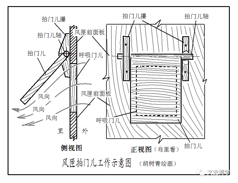 风匣前头的上下各有一个方孔拍门儿,俗称“呼吸门儿”,其作用是开启时向内吸气,闭合时不使空气漏出。用风匣扇风时,随着风匣杆儿的拉动或撺入,前后的呼吸门儿交替启闭,从而实现连续把空气吸到风匣里。
