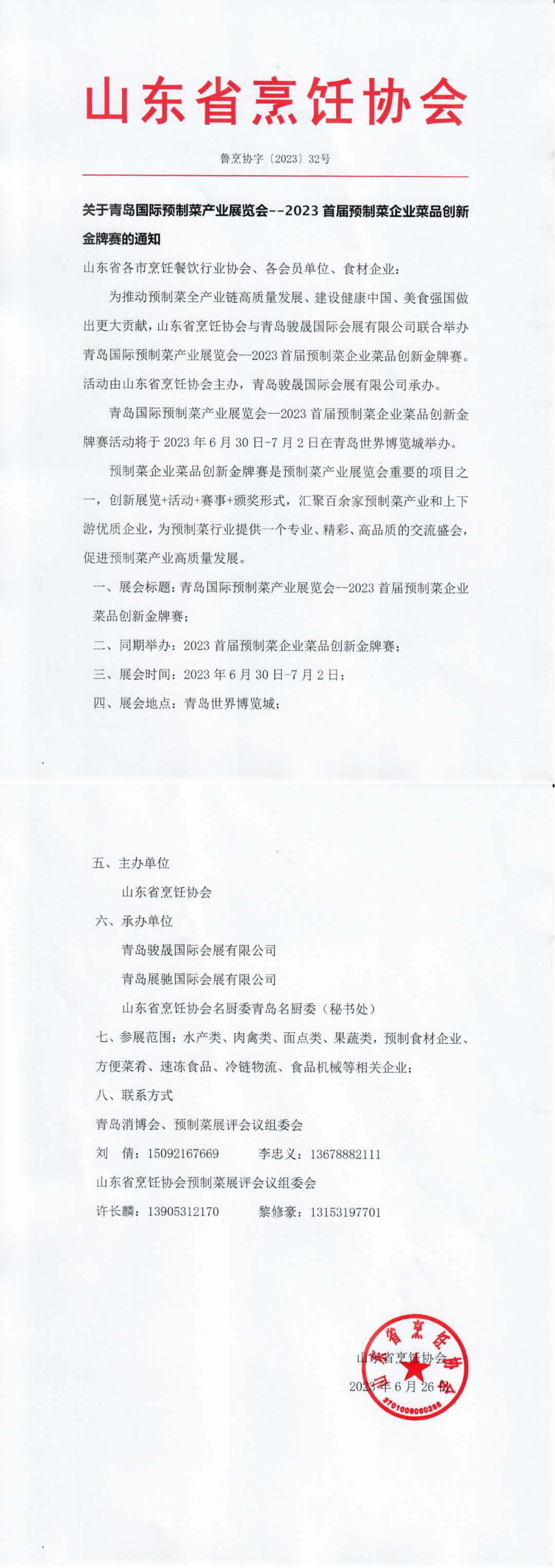关于青岛国际预制菜产业展览会--2023首届预制菜企业菜品创新金牌赛的通知