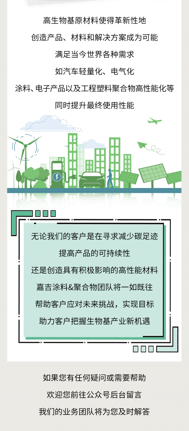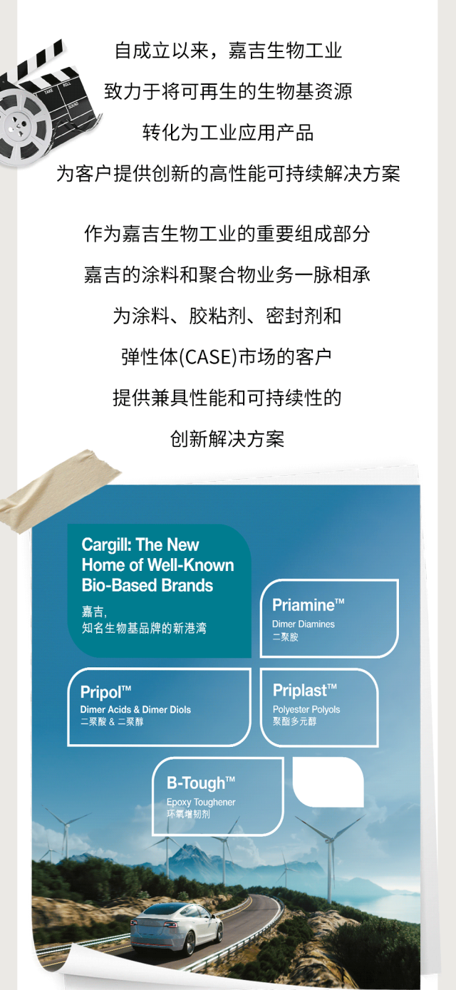 嘉吉涂料和聚合物业务为涂料、胶粘剂、密封剂和弹性体(CASE)市场的客户提供兼具性能和可持续性的创新解决方案。高生物基原材料使得革新性地创造产品、材料和解决方案成为可能,满足当今世界的各种需求,如汽车轻量化、电气化,涂料、电子产品以及工程塑料聚合物高性能化等,同时提升产品最终使用性能。