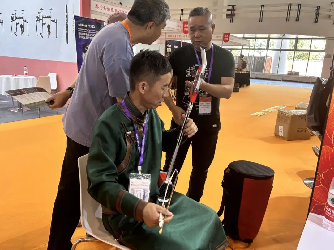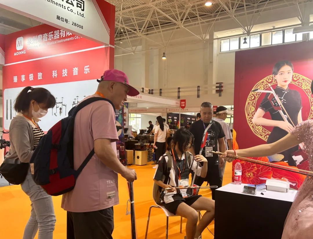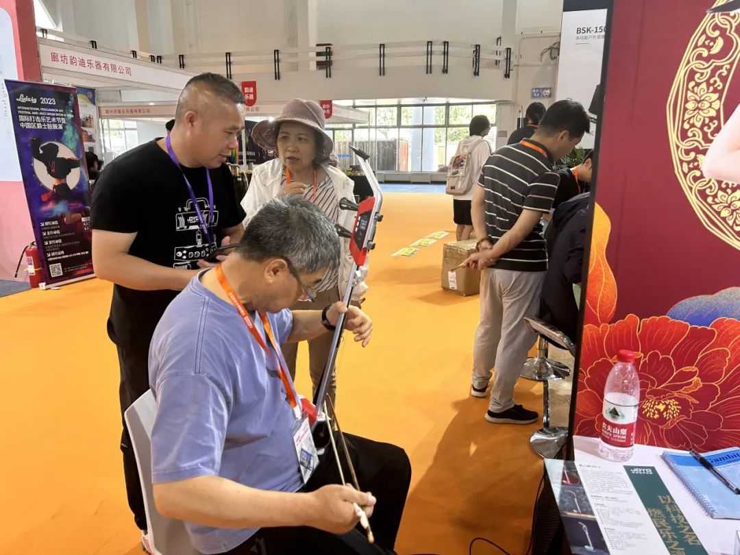 电二胡展区,悠扬婉转的旋律吸引了众多二胡爱好者们前来体验: