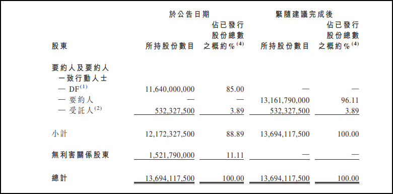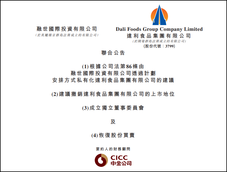 根据公告显示,达利食品及要约人融世国际联合公布,2023年6月27日,融世国际要求董事会向计划股东提出建议,建议透过计划安排方式拟私有化达利食品,建议撤销达利食品于联交所的上市地位。受托人股份将不属于计划股份的一部分,亦不会被注销。要约人将持有已发行股份约96.11%,受托人将持有已发行股份约3.89%。待计划生效后,达利食品将按照上市规则的规定向联交所申请撤销股份。