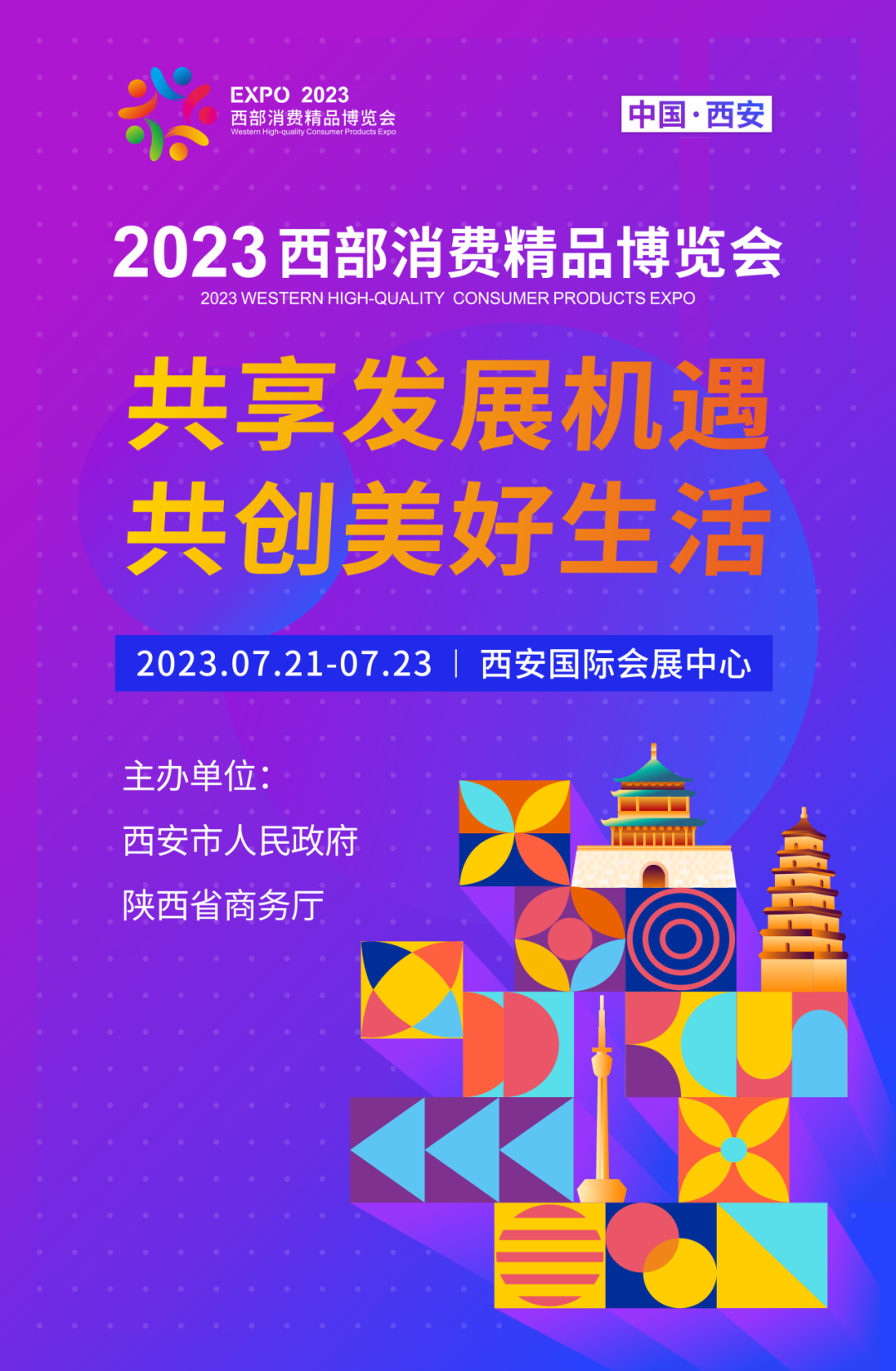 2023西部消费精品博览会标识采用旋转对称图形,视觉上产生一种重复的共性,具有韵律统一的形式美,体现了展会“高、新、精、尖”的消费精品理念;同时靓丽的色彩搭配,代表展会上多样的展出商品,丰富百姓消费商品选择,更好地满足人民美好生活需要。