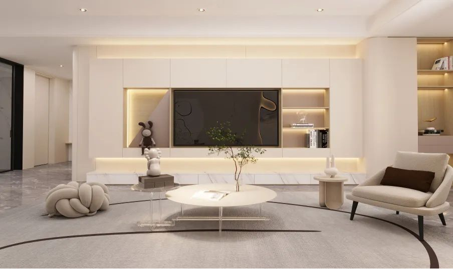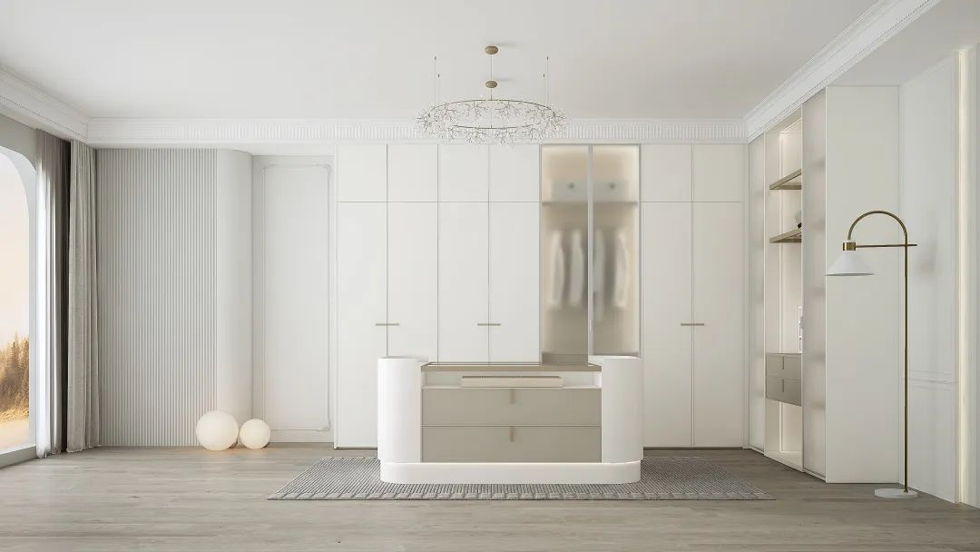 其中贝拉系列以曲线优美的贝壳与圣洁月光完美融合,创造出如梦如幻的空间氛围。整体色调柔和,奶白色、奶咖色、奶灰色互相融合,赋予空间温柔的力量。同时,悬空式床头柜与衣柜形成一体,简洁大气,视觉效果极佳。拱形掩门结合同款玻璃门搭配嵌入式金色拉手,在收纳与展示中寻找平衡,创造出精致的空间状态。