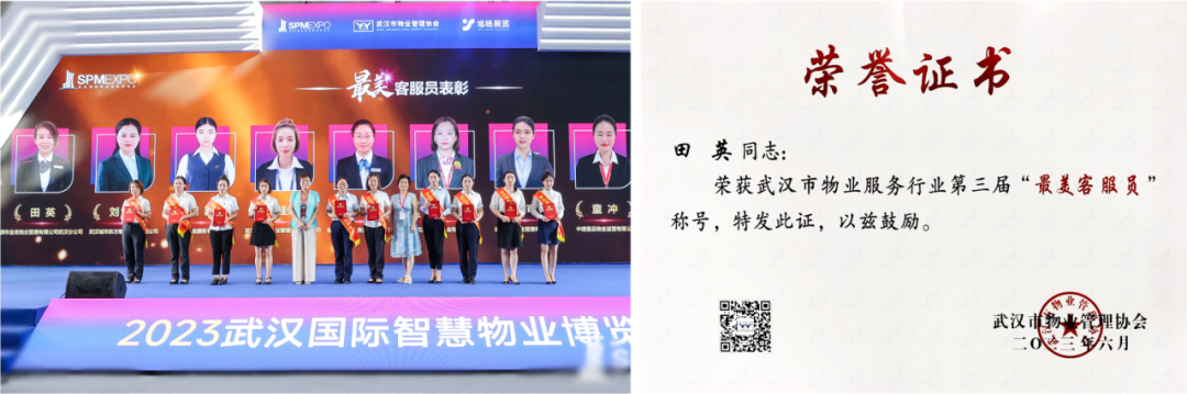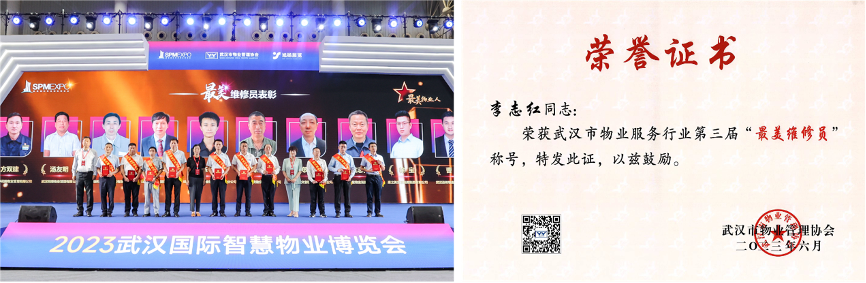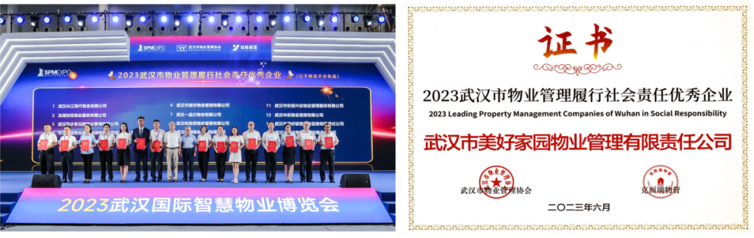 同时,美好家园物业公司荣获“2023武汉市物业管理履行社会责任优秀企业”、美好家园物业风华天城物业管理服务中心维修员李志红喜获“最美维修员”等称号(以上奖项均来源于武汉市物业管理协会发布榜单)。