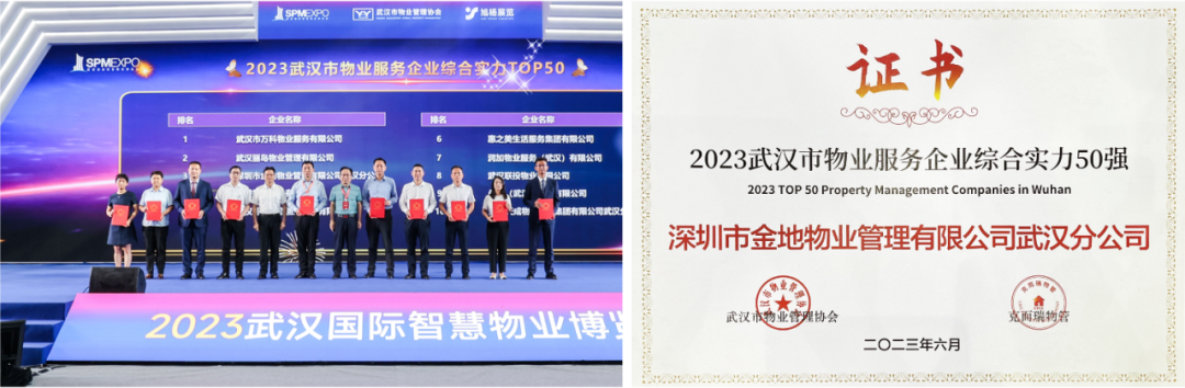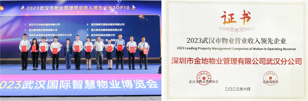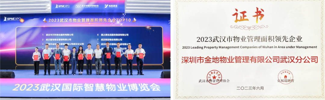 时间见证成长,口碑成就实力。作为武汉市物协副会长单位,金地智慧服务集团华中区域公司是本次物博会重要参展企业之一。与200+优质参展企业一同集中展示了智慧社区、城市建设的服务创新及红色物业、党建引领下的企业高质量发展优势。开幕仪式后,武汉物博会隆重发布“2023年武汉市物业服务企业综合实力50强名单”,现场举办“最美物业人”表彰颁奖仪式,金地智慧服务集团华中区域公司凭借卓越的服务品质和管理能力,荣获“2023武汉市物业服务企业综合实力50强TOP3”、“2023武汉市物业管理面积领先企业”、“2023武汉市营业收入领先企业”、武汉金地澜菲溪岸物业管理服务中心管家田英喜获第三届“武汉最美物业人”之“最美客服员”等多项荣誉。