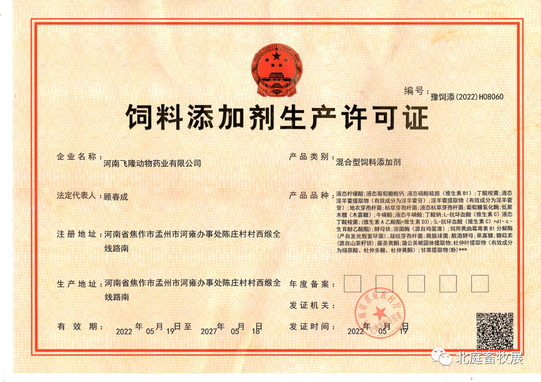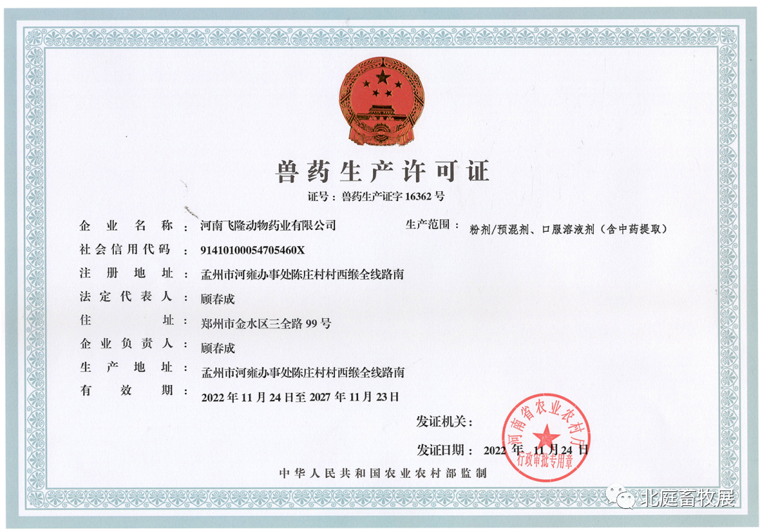 飞隆药业集团下属有三大生产基地、河南飞隆动物药业有限公司、河南飞隆饲料有限公司、河南飞隆饲料添加剂有限公司(固体线 液体线)其中河南飞隆动物药业有限公司现有大小容量水针、中药提取、口服溶液、粉剂、散剂、颗粒剂、消毒剂等十条生产线;无论规模还是剂型都走在全国畜牧业前列,为畜牧业提供全面、优质、高效的后勤保障。